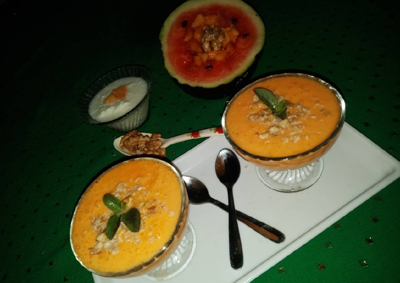 - Pour it into glass or bowl garnish it some crushed walnuts and mint leaves. Serve it chilled.