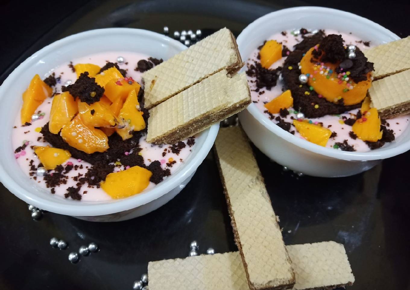 - Now to serve it take a bowl add brownie or fruit cake.Layer it with chilled strawberry custard.then again put a cake or brownie piece in middle.crumble some brownie or cake on sides.add mango pieces on it.and on sides too.Sprinkle silver balls and coloured balls.. insert waffers on side and serve chilled